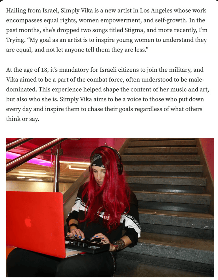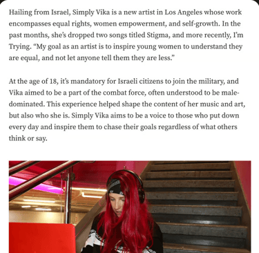 Simply Vika is a Russian-Israeli artist currently based in New York City. She is known for blending genres like rap, pop, and EDM, often addressing social issues such as gender equality and empowerment. Her music reflects her multicultural background as she creates in English, Russian, and Hebrew. Inspired by personal experiences and societal challenges, Vika channels her emotions into bold, dynamic songs and visual